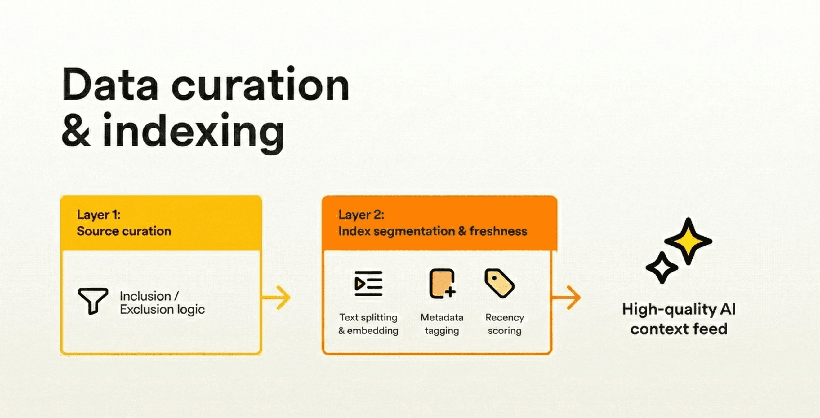 Source curation: Deliberate inclusion/exclusion based on relevance and accuracy (e.g., separate technical docs from marketing collateral); per-domain corpora for product, support, sales, etc.